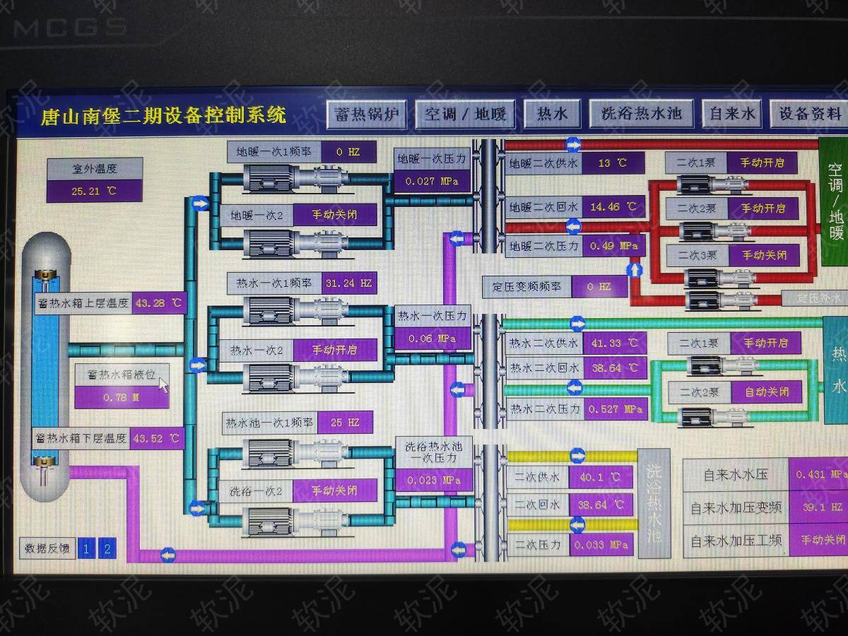 1. 項(xiàng)目位于唐山市曹妃甸區(qū),北堡村附近。冷水自來(lái)水加壓泵,變頻調(diào)速維持水壓恒定。熱水通過(guò)板式換熱器獲得蓄熱水箱的熱能,維持恒溫。 2. 給大水箱蓄熱到恒定溫度,溫度不足時(shí)自動(dòng)啟動(dòng)加熱管(當(dāng)?shù)仉妰r(jià)統(tǒng)一,沒(méi)有峰谷電價(jià)) 3. 制冷時(shí)使用空調(diào)直接對(duì)二次網(wǎng)降溫。制熱時(shí)二次網(wǎng)水泵不間斷運(yùn)行,一次網(wǎng)水泵通過(guò)間歇運(yùn)行給板式換熱器維持恒定溫度,從蓄熱水箱獲取熱源。 4. 所有傳感器和設(shè)備運(yùn)行數(shù)據(jù)接入軟泥物聯(lián)網(wǎng)系統(tǒng),自動(dòng)運(yùn)行,機(jī)房無(wú)人值守,通過(guò)手機(jī)軟件可隨時(shí)查看設(shè)備運(yùn)行情況。 |